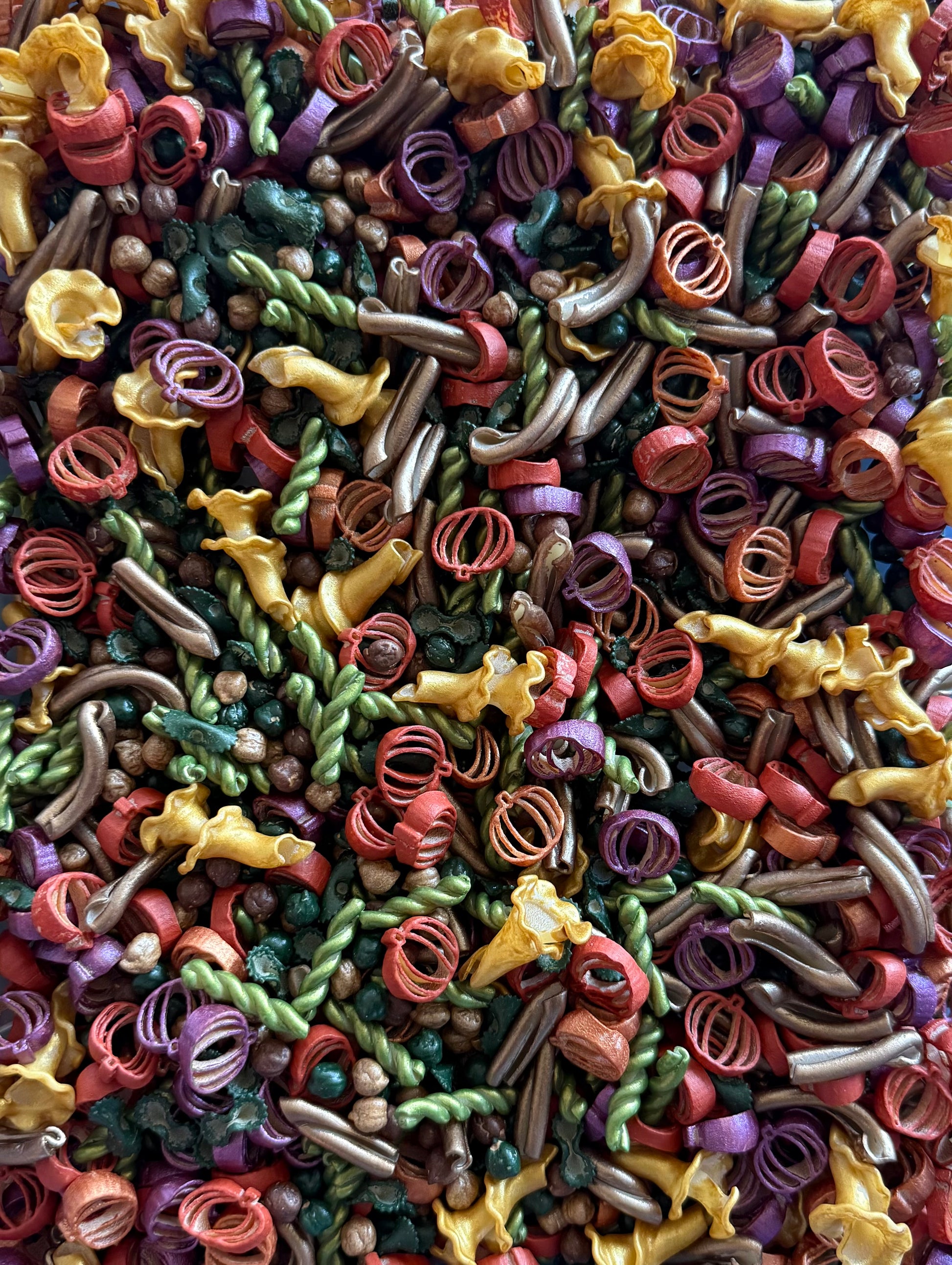 All mixes are coated with non-toxic acrylic paint. Colours may vary from batch to batch as all materials are coated by hand. Amount of pasta shapes will vary from bag to bag.