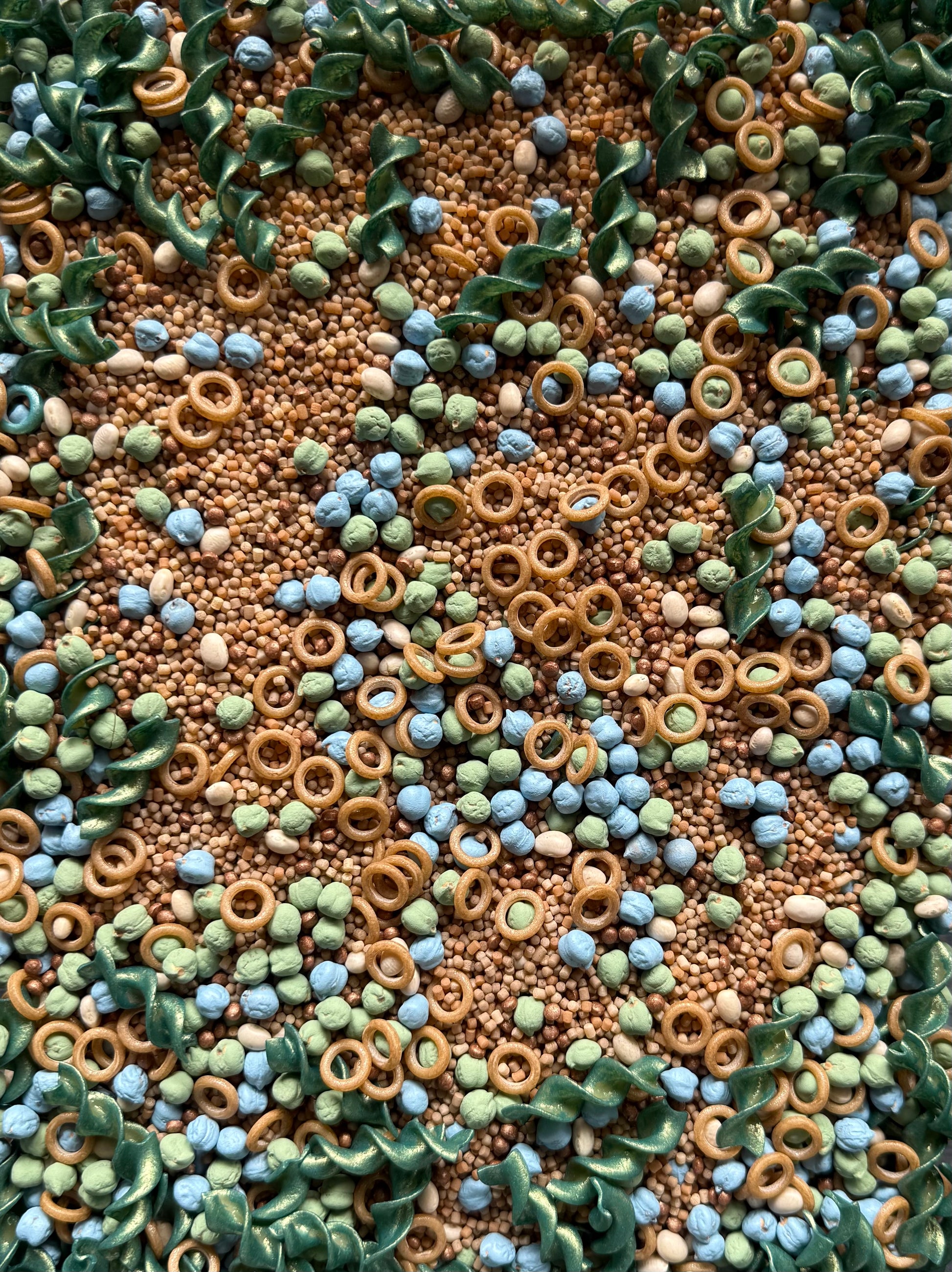 All mixes are coated with non-toxic acrylic paint. Colours may vary from batch to batch as all materials are coated by hand. Amount of pasta shapes will vary from bag to bag.